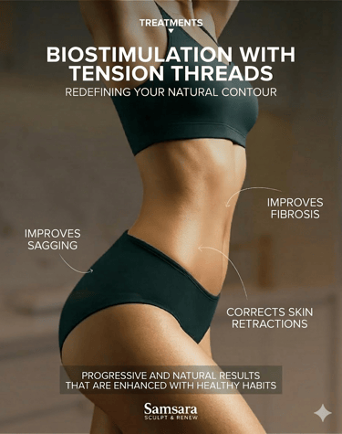 This innovative procedure provides tissue support and repositioning, specially designed to improve skin fibrosis, skin retractions (due to excess fat or previous surgical procedures), and sagging. Enjoy progressive and natural results, which are enhanced by healthy exercise and eating habits. Restore your skin's firmness and definition with a comprehensive and personalized approach.