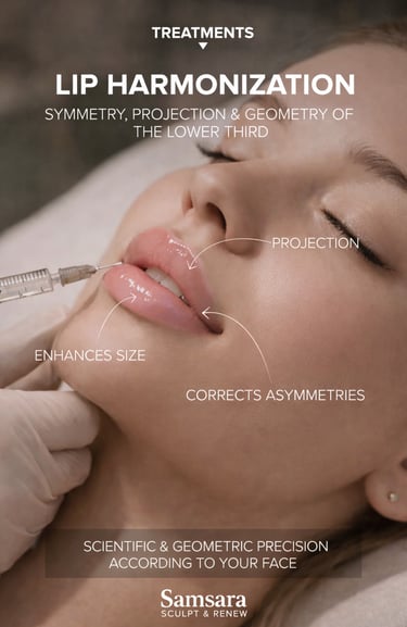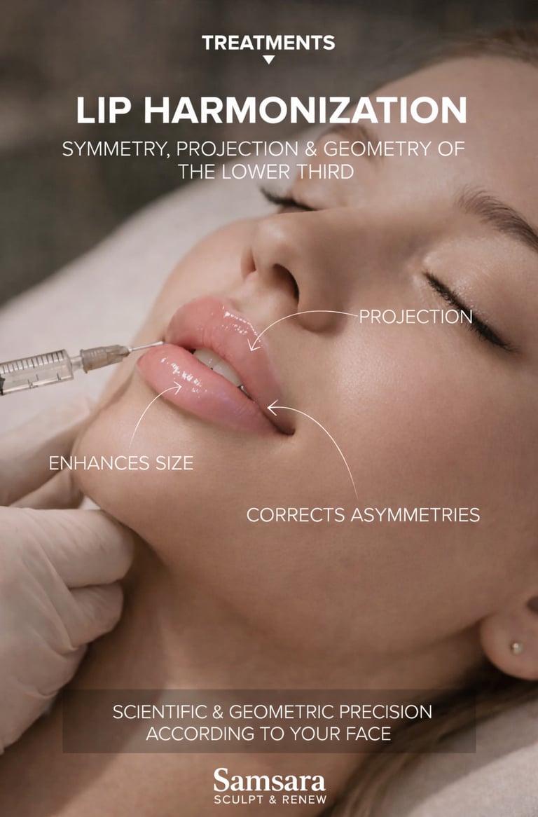 Our lip harmonization technique goes beyond volume and projection; it involves sculpting with scientific and geometric precision to suit your face. We focus on enhancing size, correcting asymmetries, and achieving the ideal projection based on your unique facial anatomy and personal preferences. We respect individual proportions to enhance your natural beauty, resulting in defined, hydrated lips that are perfectly integrated with the harmony of your face.